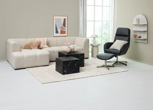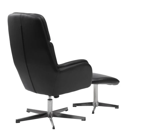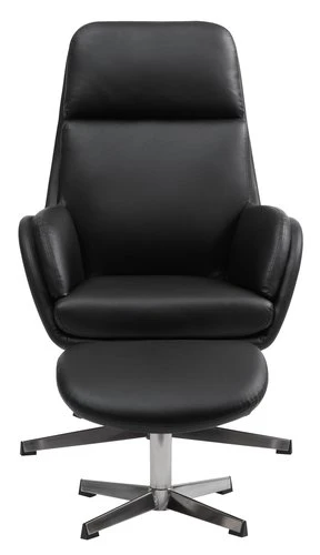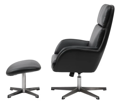 En contreplaqué, acier. Garnissage : mousse polyuréthane. Revêtement : polyuréthane. Base pivotante : acier. Inclinable. Incl. repose-pieds. l70 x H107 x P77 cm