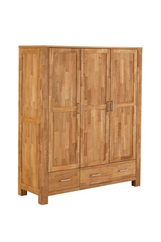 Chêne massif et placage chêne. Portes soft-close. Tiroirs soft-close. Intérieur la garde-robe : 6 étagères et 1 tringle à vêtements. l169 x H200 x P60 cm
